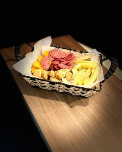 Crujientes papas fritas, pollo, salchica en tajadas y deliciosas cremas.