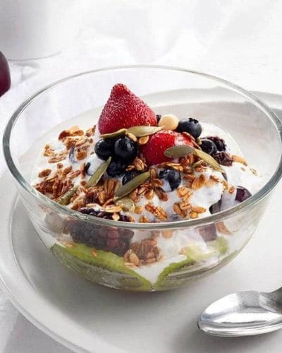 Frutas frescas picadas bañadas con yogur natural, sano y refrescante.