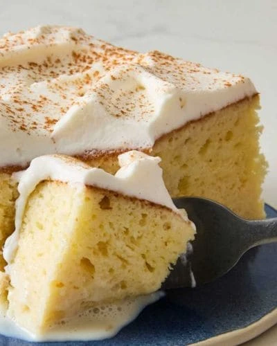 Esponjoso bizcocho bañado en tres leches, coronado con suave merengue.